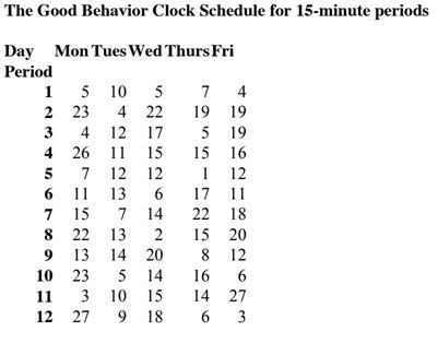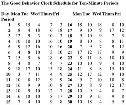 The timer, the recording sheet and the schedule, taped inside the Tupperware bowl, are given to one of the group leaders to free up the teacher. At some point within each of the designated periods, the timer will ring. The teacher immediately scans the groups of students and awards points and praise to each group for working quickly and quietly, or not as the case may be. The timekeeper then resets the clock to the next setting and the teacher continues with the lesson. The students soon learn that the timer may ring at any moment, so that it is best to keep working. Soon the students learn to work for longer and longer periods and the clock can be set for longer periods until it is no longer needed. Each day the points are totaled 21 and announced with great fanfare to the entire class. For the next 10 weeks we will work with 5 and 10 and 15-minute schedules of reward. In the first reinforcement schedule given below, the clock will ring at some time within a five-minute period. In the second reinforcement schedule, the period is set for the clock to ring with a ten-minute period. As a result, the number of periods decreases from 60 periods per day to 30 periods per day when students have learned to work long enough to change the schedule from 5 to 10 minutes. In order to maintain the integrity of the system, the points awarded on the ten-minute schedule have to be doubled. In the third example, the reward periods occur at some time within a fifteen minute time span. Once again the reduces the frequencies of opportunities for rewards so that the number of points earned needs to be adjusted so that the students can earn the same number of points.