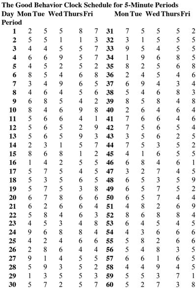 Sometimes it is difficult to get children to attend to the task at hand, especially when we want them to work independently on some assigned work. It becomes critical that you can control their production and their interruptions. There are several successful strategies that are likely to assist teachers or parents to do this. The Good Behavior Clock is one such strategy. Dr. Edward Kubani of University of Hawaii first reported The Good Behavior Clock in the educational research literature some thirty years ago. It worked then and it still works today. Materials Required; To create the Good Behavior Clock you need a kitchen timer, a Tupper Ware bowl, a table of random numbers from a statistics book, a reinforcement schedule, a Points Record Sheet, a pencil, and a reward agreed to by parent and child. Procedure: The teacher, classroom aide or another student sets the timer to a prescribed time as indicated by the reinforcement schedule which is taped inside the Tupper Ware bowl. The bowl then placed over the timer while the student works. When the timer sounds, the parent or teacher immediately looks to see if the child is working. If so, a point is awarded and recorded and the timer is set to the next setting indicated by the schedule and covered by the bowl. At the end of the session, the points are added to the Point Record Sheet and the student can determine how many he has accumulated and how many more are required to “purchase” his reward. Step One – Determining the Current Independent Work Period Length You first have to determine the length of time that the students currently are able to work quickly and quietly. This assumes that the child has been properly instructed and is actually able to do the work demanded in 20 the assignment. Determining the baseline for independent work is accomplished by keeping a record of the Students’ on-task behavior for several days. Once you have that data, you can determine the average length of time that these students work on task. Most teachers have a pretty good ballpark notion of this from their previous work with the class. Once you know the length of the average on-task work period, you determine the amount of total time that you expect the child to be engaged in academic work. In a normal classroom day, there are approximately 300 minutes of educational time. If the student can work on-task for only 5 minutes at a time, there would be 60 individual work periods (60 periods of 5 minutes = 300 total educational minutes). If the child were capable of 10- minute stints of on-task work, there would be 30 periods per day (30 periods of 10 minutes = 300 educational minutes). Step Two – Setting up a Reinforcement Schedule A schedule is then devised using these periods. The consultant constructs a different schedule for each day of the week so that the schedule does not become predictable. An example of the timer settings using 60 periods of 5 minutes is outlined below. The clock is set on Monday for the first period. It will ring after 2 minutes. That leaves 3 minutes remaining in the first period. Those 3 minutes are added to the second setting (2 minutes plus 3 minutes = 5 minutes) so that the clock will ring again in 5 minutes. When the clock rings a second time, there are still 2 minutes left in the second period. These are added to the 2-minute setting for the third period to yield a setting of 4 minutes. This system generates a series of clock settings which determines the times for reward for the entire school day. Schedules for 5 and 10-minute reward periods are set out below.